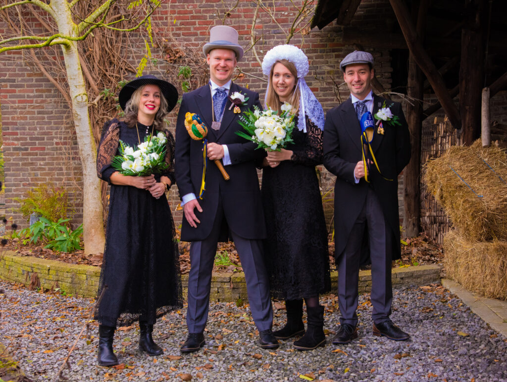 Same mèt eur getuge Rianne en Luc zien zeej lid van de optochgroep “ VG dae vogel geit neet op/ in ’t dagelijks laeve ouch waal ‘de Raven’ geneump. En mèt dees club nimme zeej ouch altied deil aan de sjoeëne optoch in Belvend.
